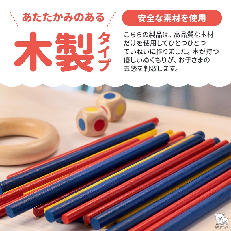 - Material: Made of high-quality birch wood with a moderate weight and a very good texture, and safe paint. Set includes 9 large blue sticks, 9 medium red sticks, 9 yellow sticks, 1 wooden ring, 2 dice. Country of Manufacture: China