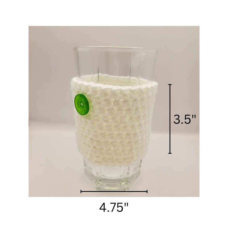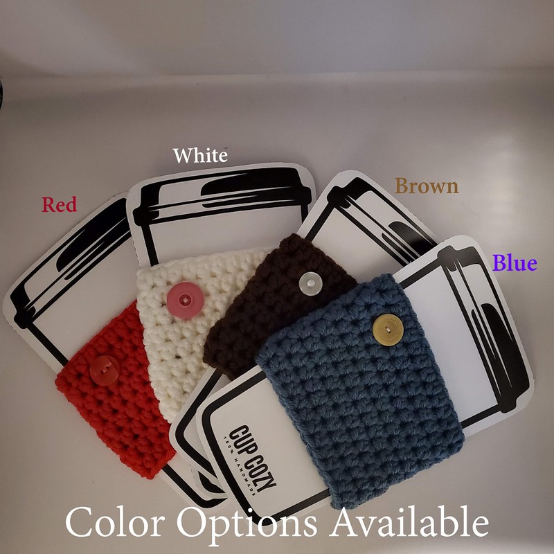 Do you love cozies for your coffee or drink cups? Dress up your next cup with this buttoned cozy. Fits 12-16oz to go cups, tumblers, and glasses. Button types will vary as each cozy is embellished with a different button type.