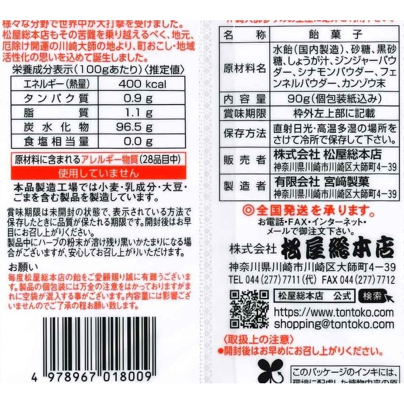 - 原材料:水飴(国内製造)、砂糖、黒砂糖、しょうが汁、ジンジャーパウダー、シナモンパウダー、フェンネルパウダー、カンゾウ末