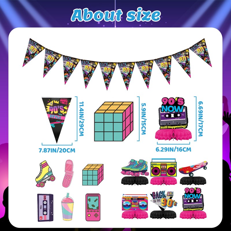 - Party decoration kit: this 90s themed hanging decorations includes 22 different decorations, including 10 years pennants, 6 hanging spirals and 6 honeycomb, which will add a strong nostalgic atmosphere to your party