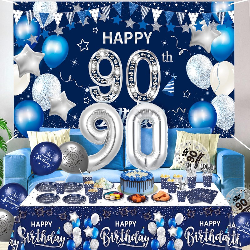 - Blue 90th Birthday Party Supplies: This navy blue 90th birthday decorations set are designed stars and balloons on navy blue color with happy birthday elements makes the 90th birthday party supplies more vivid and charming; The blue silver 90th birthday banner balloon set, combines with silver foil curtain backdrop and navy blue silver tablecloths plates cups napkins party dinnerware set to decorate your birthday party, which can make your birthday warm and unforgettable