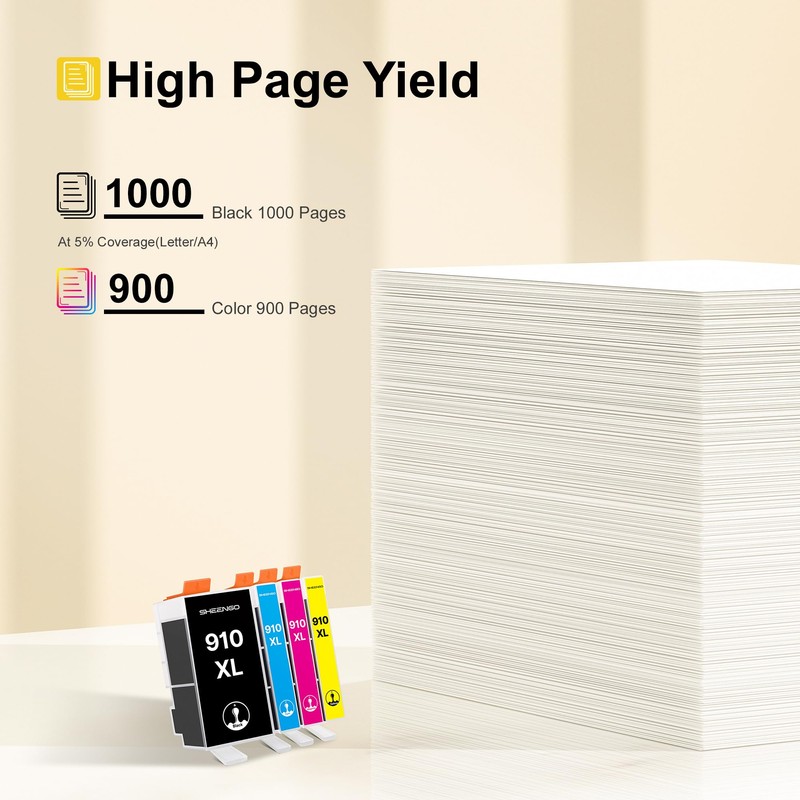 - High Page Yield: Each 910xl black ink cartridge delivers an impressive high page yield of up to 1,200 pages, while the hp910xl/910 multipack color ink cartridges provide up to 1,000 pages each (based on 5% coverage of A4 paper)
