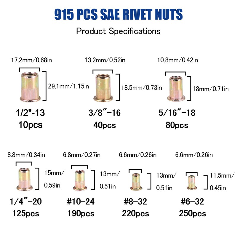 - 【What You Get】915pcs SAE UNC rivet nuts. Come with durable PP storage case with size/ type chart. If you're unhappy with our product for any reason, please feel free to contact us.