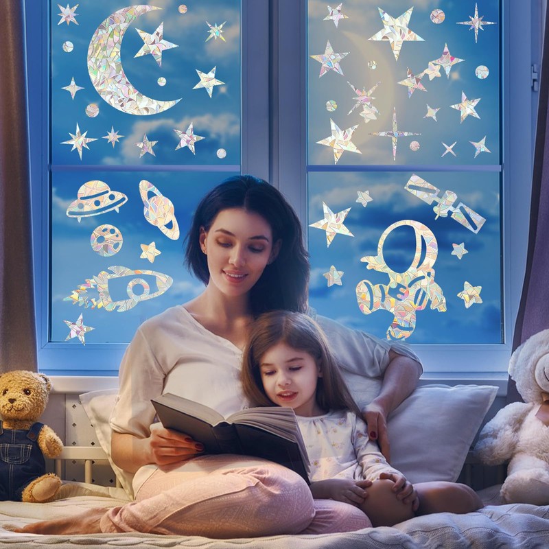 92 Piece Astronauts Stars Moon Window Clings, Anti-Collision Decals to Save Birds from Window Collisions, Static Cling Window Sticker, Rainbow Stickers