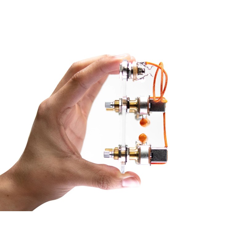 A 920D Custom LP50-SPLIT Les Paul Wiring Harness is built to easily drop into your guitar and totally transform your tone. With genuine Orange Drop capacitors your guitar will have the classic sound of a vintage Les Paul. This wiring scheme provides a tight, transparent tone. Unlike modern wiring schemes, it features a reduced treble cut when rolling back the volume control. The highs seem to be clearer, especially with the volume pot rolled back. This harness effectively gives you a treble bleed kit function on each volume pot without adding the extra caps and resistors. The Push/Pull tone pots will split each respective pickup. If you are looking to clean up your tone and let your pickups sing through, then the LP50-SPLIT is for you.