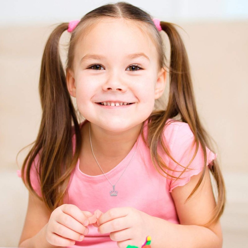 - DETAILS: This princess crown pendant necklace for girls is simply enchanting! Surprise every girl (Ages 5-14yrs) on her special day with this cute and fashionable cubic zirconia necklace. The pendant was beautifully accented with stunning pink cubic zirconias. Carefully crafted entirely of 925 sterling silver, making them suitable for young girls with sensitive skin. Perfect gift for every occasion or daily accessory. A Complimentary gift box is included for easy gift giving!