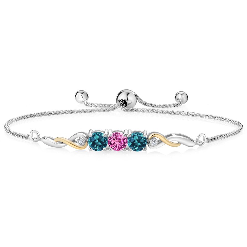 925 Sterling Silver and 10K Yellow Gold Pink Created Sapphire London Blue Topaz and Lab Grown Diamond Tennis Bracelet For Women (1.97 Cttw, September Birthstone, Fully Adjustable Up to 9 Inch)