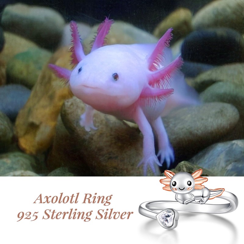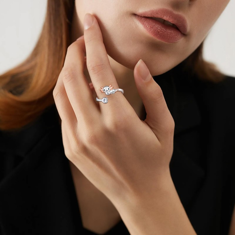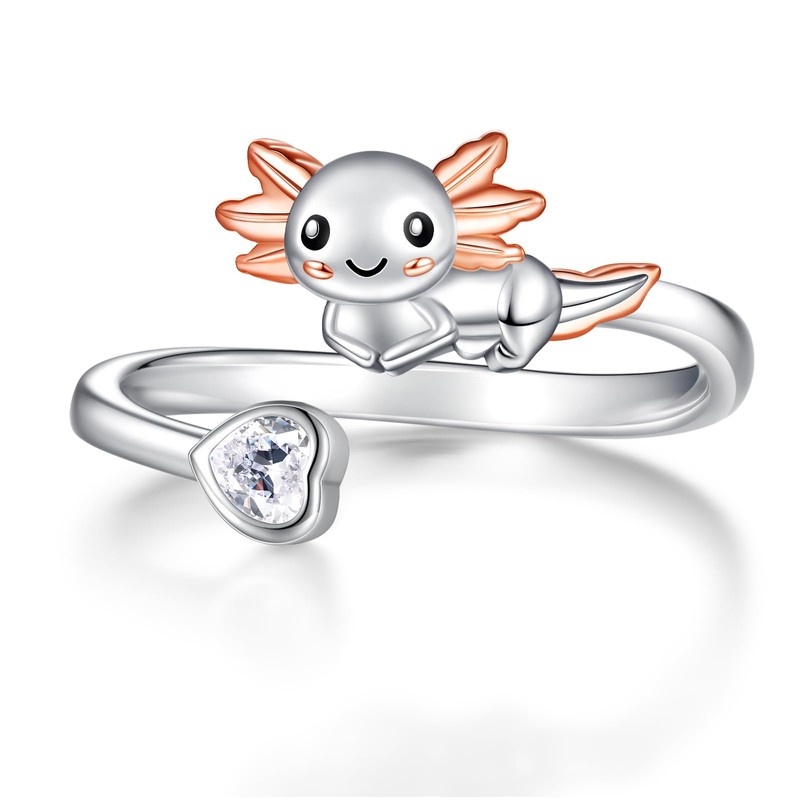 925 Sterling Silver Animal Ring - Adjustable Open Owl Axolotl Rings with Heart Cubic Zirconia Opal Cute Animals Jewelry Gifts for Women (Axolotl Ring)