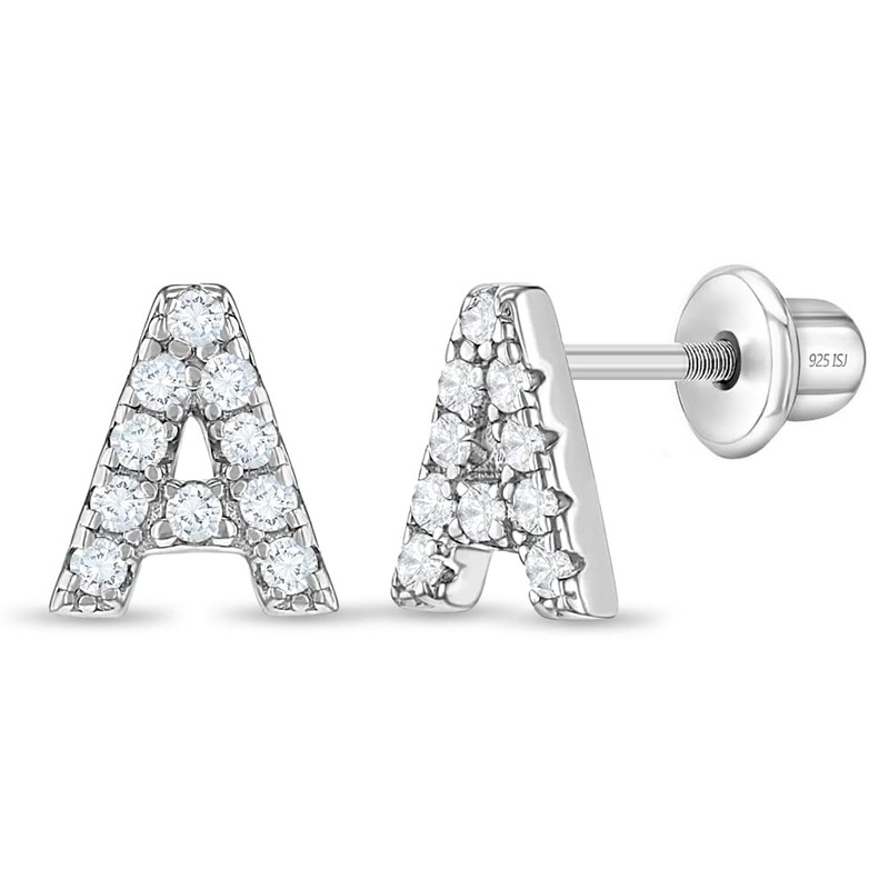 - Details: Your little girl will shine with this adorable pair of initial letter earrings. This fun pair of letter "A" earrings were delicately designed with glimmering cubic zirconia stones all throughout the letter, adding a sparkly touch to your girls daily outfits. Crafted in pure 925 sterling silver, that is naturally hypoallergenic. The posts are threaded and feature a safety screw back design to secure your earring (Ages 5-17 yrs). A beautiful gift box is included with your purchase.