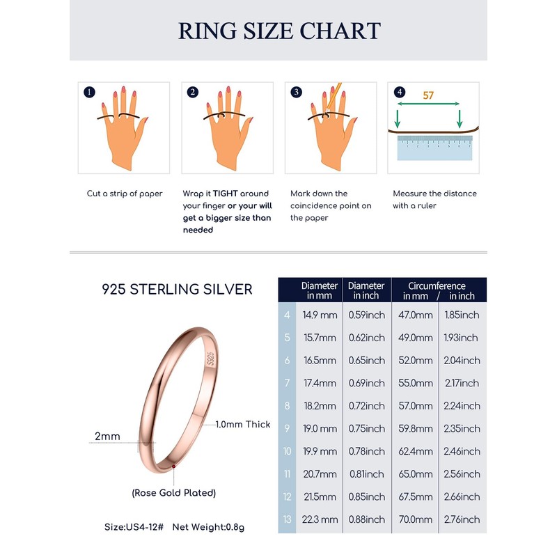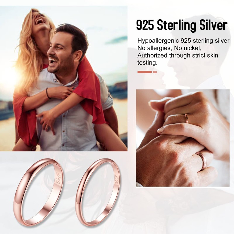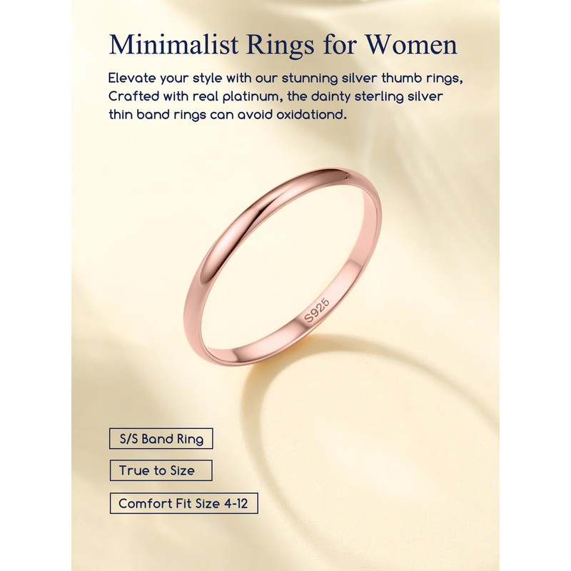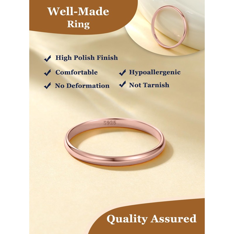 - 2MM BAND RING: Rose gold plated solid 925 sterlings silver delicate thin band rings. The ring is smooth, well made, and very shiny. Comfort fit size 4-12.