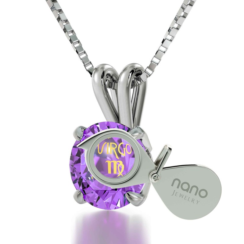 - Virgo necklace intricately inscribed on light purple colored Swarovski crystal in 24k Gold using innovative technology with the zodiac star sign and symbol