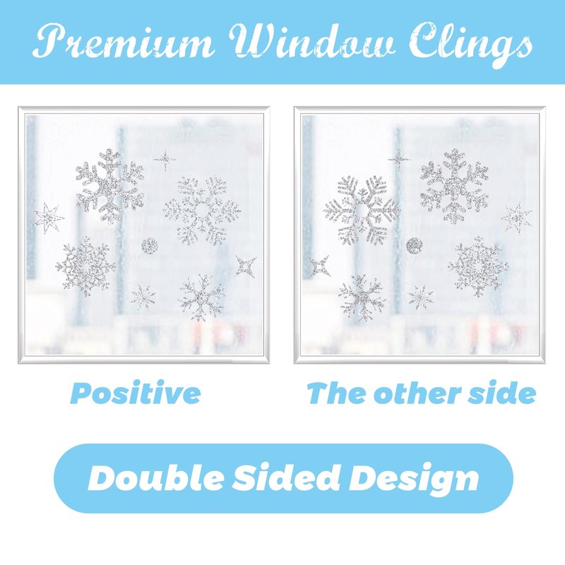 • Double sides : you can see these xmas window clings decorations from both sides , whether you look at them from inside or outside. Take this DIY snowflakes stickers window decor for instance. It turns your entire house into a winter ! Chrismtas snowflake window stickers are made of durable material, can last for a long time, so you don't worry about fading.