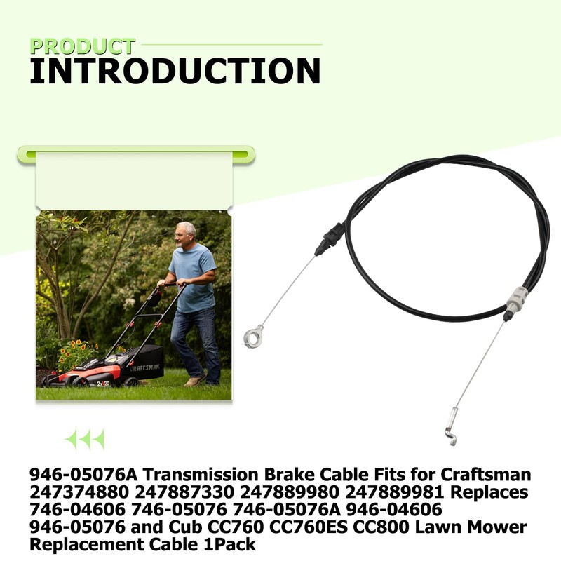 - Compatibility: The 946-05076A transmission brake cable is a perfect fit for MTD, Craftsman, and Cub-Cadet mowers. Specifically designed for models like Cub-Cadet CC760, CC760ES, CC800, and various Craftsman models. Replaces multiple part numbers, ensuring you get the right replacement for your mower