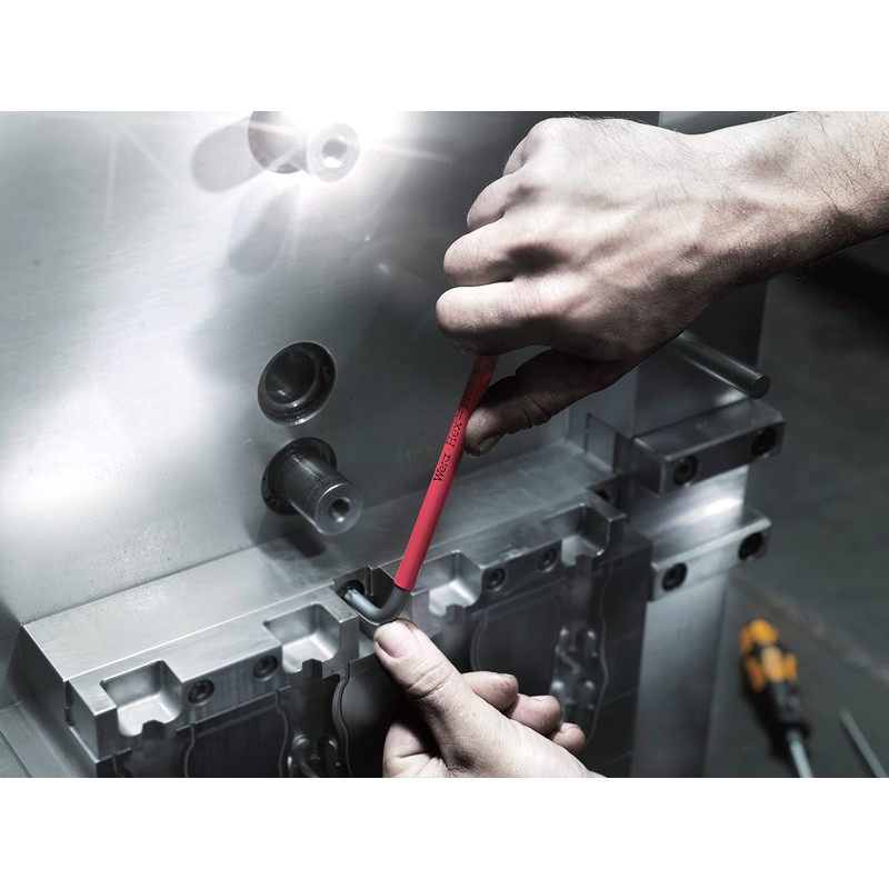 High quality Wera L-keys with colour coded, convenient plastic sleeve. This means that the tool is quickly accessible and the ergonomic and pleasant handle is easy on the hands even at low temperatures. Hex-Plus L-keys provide larger contact surfaces on the screw head. The notching effect is thereby reduced to a minimum; the destruction of the screw head is almost eliminated. The ball on the long arm allows safe working even in difficult mounting positions. The BlackLaser surface treatment provides excellent surface protection, corrosion resistance and long life. Laser coated abrasion- resistant size markings on the L-keys for quick access.