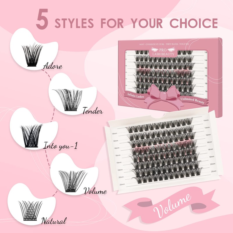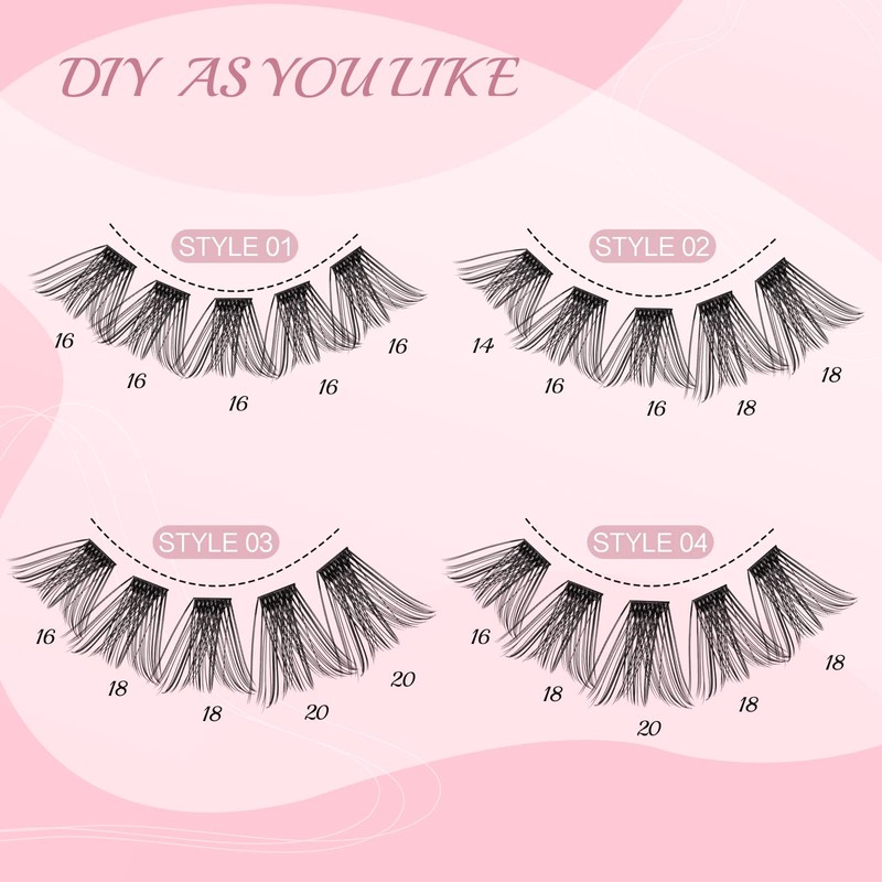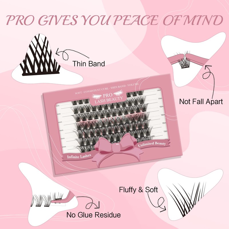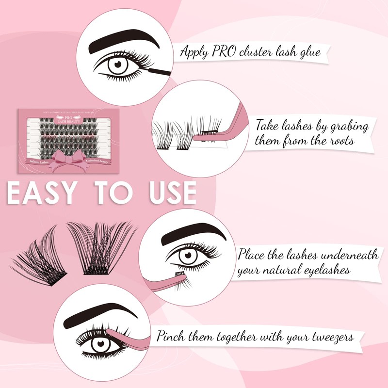 - Bring salon to your home: Pro LashBeauty Lash clusters are easy to apply. Divided individual Lashes into sections, easy to pick up and apply by yourself. You can apply the eyelashes with different lengths and styles according to different occasion. Save money from doing eyelash extensions. You will become a master of DIY lash extensions with a little practice!
