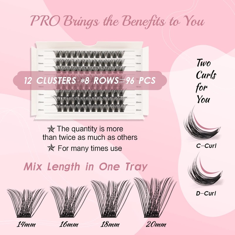 - 96 Pcs Cluster Lashes: The hottest Cluster lashes among the social media are avaiable now! Different from other brands, PRO LashBeauty can provide 96 pcs in one tray! Mix Length from 14mm to 20mm. Same Price you can get more lashes and use more times.