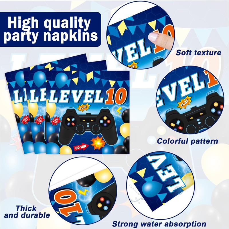 - Packing content: Our 10th birthday video game party decorations include 24pcs 9 inch video game birthday party dinner plates, 24pcs 7 inch level 10 birthday party dessert plates, 24pcs video game napkins and 24pcs blue forks that suitable for a 10th birthday party. This 10th video game tableware will leave a lasting impression on all your guests.