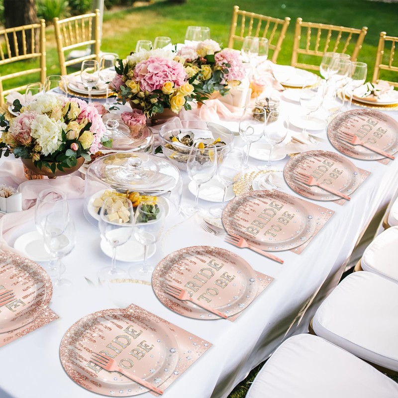- Package includes: Each set includes 24 pieces of 9 inch/ 23cm rose gold dinner plates, 24 pieces of 7 inch/ 18cm bride to be dessert plates, 24 pieces of 6.5 inch/ 16.5cm rose gold napkins, and 24 pieces of pink forks. This complete set is ideal for serving 24 guests and will create a visually impressive table setting for your wedding.