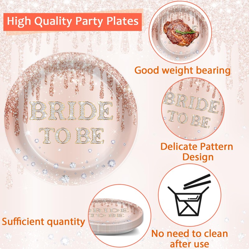 - Eye-catching design: Our bride to be party plates and napkins decorations are feature a chic rose gold backdrop adorned with sparkling glitter drips and dazzling diamond accents, creating an elegant and glamorous look. The bold “Bride to Be” lettering adds a celebratory touch to your table setting, making this set the ideal choice for any bridal event.
