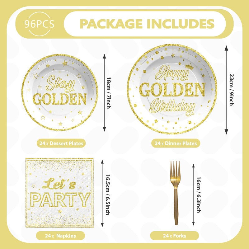 - Golden Birthday Decorations: Our golden birthday disposable tableware includes 24 * 9'' golden party plates, 24 * 7'' golden birthday plates, 24 * 6.5'' paper napkins, and 24 plastic forks. This golden theme party decorations kit is a good accessory for birthday party. It will definitely be a hit for your special event