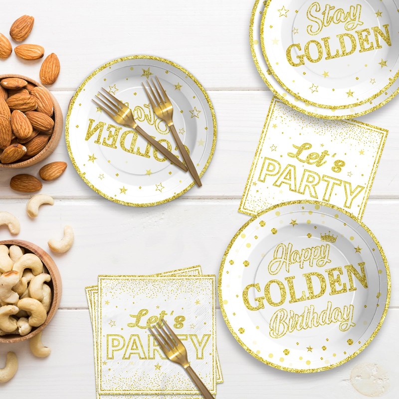 - Save Time: This golden party decorations are an ideal replacement for traditional party plates. You only need to dispose of the golden birthday dinnerware set after use, no need to wash the dishes and other tedious tasks.When the party is over, you can spend more time with family or friends and less time cleaning up