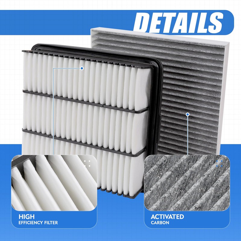 - [Speci Fications]:Engine Air Filter: ① Length: 8.465 inch;② Width:7.815 inch;③ Height: 1.96 inch;④ Package Quantity: 1; ⑤Packaging Type: Box; Cabin Air Filter:① Length: 8.93 inch;② Width: 8.26 inch;③ Height: 1.18 inch;④ Package Quantity:1;⑤Packaging Type: Box