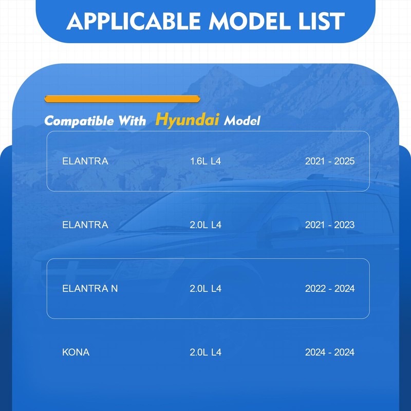 - [Vehicle Fitment]: Compatible with Hyundai Elantra-1.6L L4(2021-2025), Elantra-2.0L L4(2021-2023); Elantra N-2.0L L4(2022-2024); Kona-2.0L L4(2024)