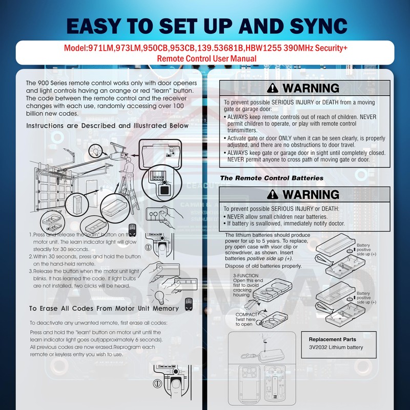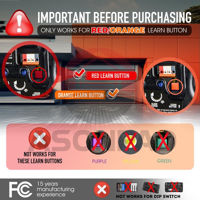 1.Only works for a RED or ORANGE Learn Button of Liftmaster/Chamberlain Garage Door Openers Security+. 2.Replacement for 971LM 973LM and 950CB 953CB remote. Attention: NOT works for remote with Dip Switches!