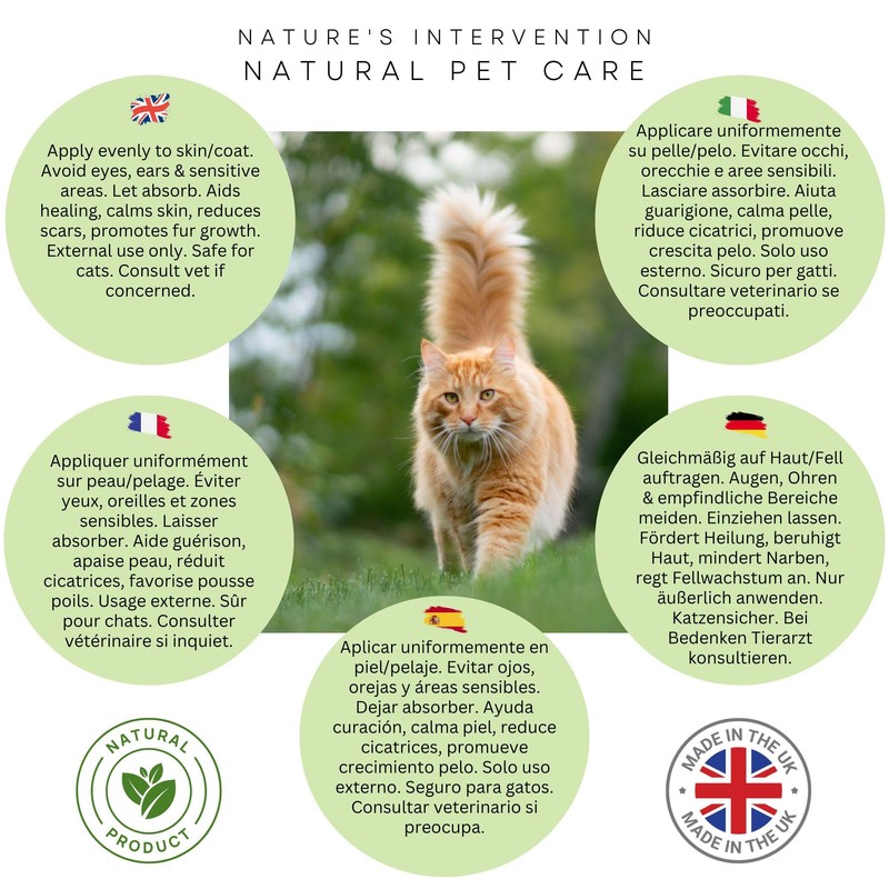 - 99% natural and pH balanced for cat skin. This gel protects and helps relieve dry, irritated skin, deters scars and promotes new hair growth, even with old scars. It soothes, cools and softens and reduces the sensitivity of dry, irritated skin.