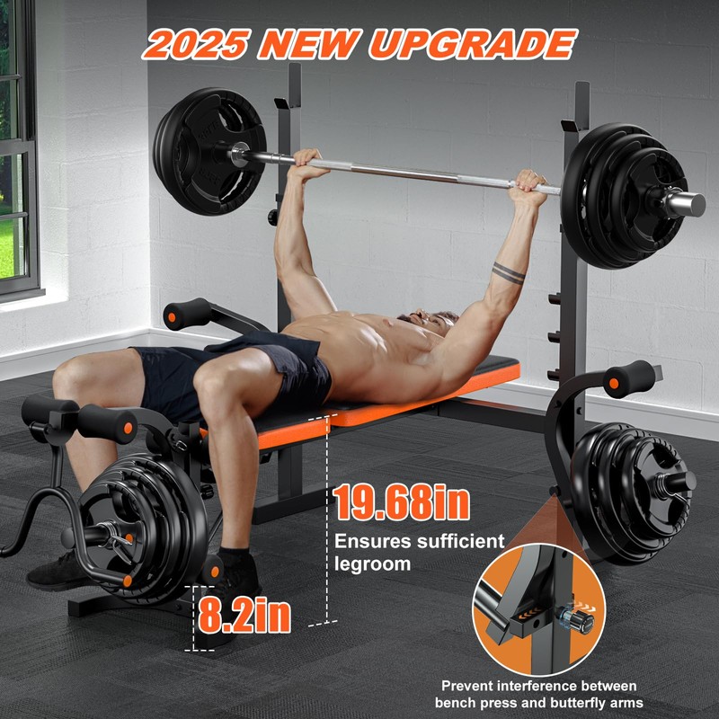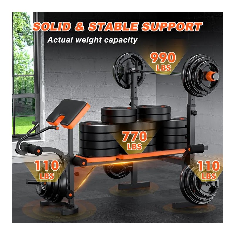 Take your home workouts to the next level with this heavy-duty 6-in-1 weight bench set. Built to support up to 990 lbs, it combines a bench press, leg extension/curl, and preacher curl pad for a full-body training experience. The adjustable barbell rack accommodates different height and exercise needs, while the backrest offers multiple incline and flat positions. Whether you're focusing on chest, arms, legs, or core, this versatile workout bench delivers pro-level performance in the comfort of your own home.