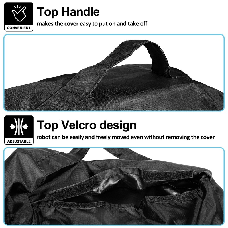 - đ€ăEasily Move and Storeă: Top Handle makes the cover easy to put on and take off. Top Velcro design ensures that the robot can be easily and freely moved even without removing the cover. Side Air Vents permit air circulation and keep moisture from building up inside the cover. Back Velcro helps tighten the cover to keep it from being blown away by strong winds.