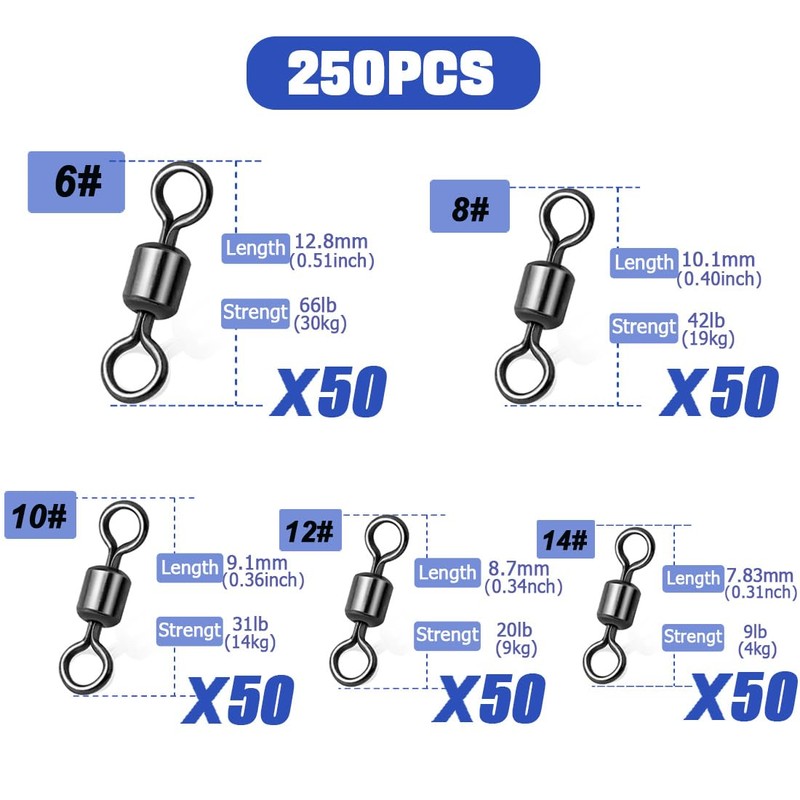 - Economical and affordable:A box contains 250 fishing swivels, available in 5 different sizes to meet your needs of catching fish of different sizes. They can be replaced at will, and the ultra-long service life can reduce the number of replacements and long-term use.