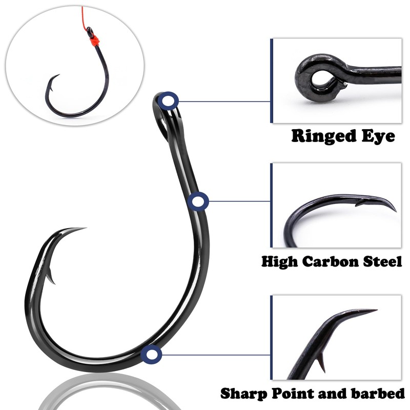 - [Catch and Release]The circle hook design makes it easier for the fish to get hooked when swallowing the bait, increasing the chances of hooking.90°bend and inline design of the hook point allow the circle hook to hook the fish's lip or chin with a high ratio.This greatly reduces fish mortality and allows anglers to better catch and release.