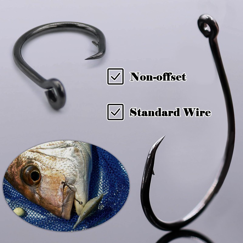 - [Catch and Release]The circle hook design makes it easier for the fish to get hooked when swallowing the bait, increasing the chances of hooking.90°bend and inline design of the hook point allow the circle hook to hook the fish's lip or chin with a high ratio.This greatly reduces fish mortality and allows anglers to better catch and release.