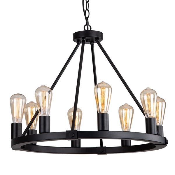 - Farmhouse And Industrial Design: Wagon Wheel Chandelier use quality and durable Matte Black Metal body and 8 Lights E26 base,offers enough lights for your decor space. Creating warm vintage relaxing atmosphere.