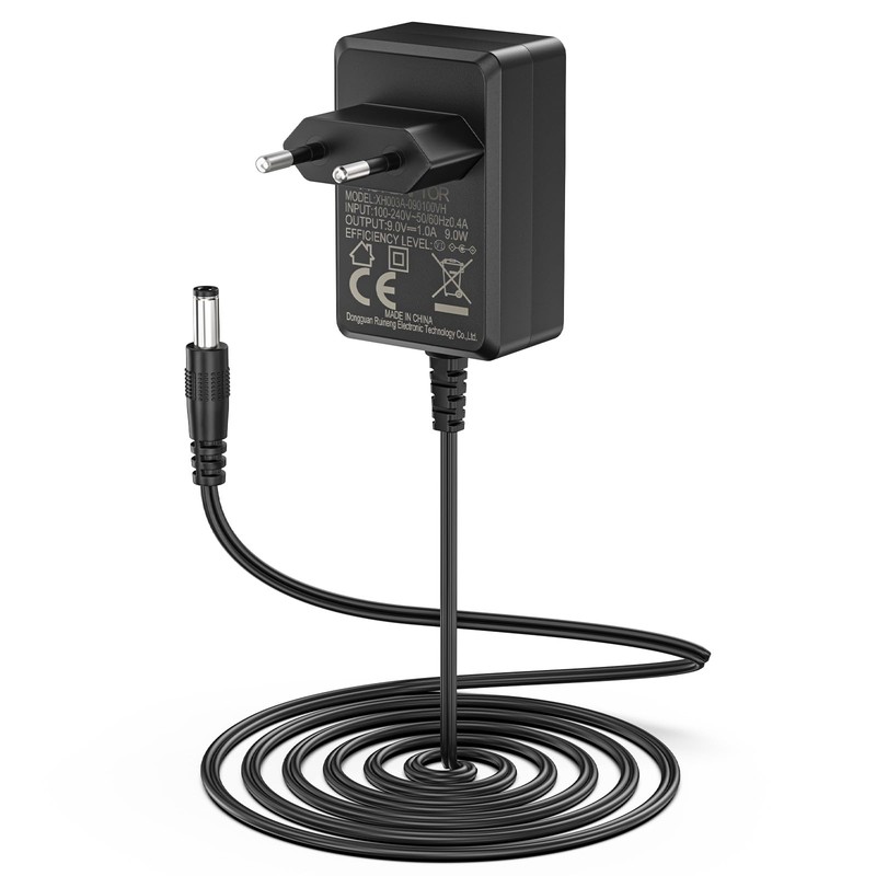 9 Volt 1A charging cable: Input: AC 100-240V 50/60Hz; Output: DC 9V 1A 9W; plug size: 5.5 x 2.1 mm.