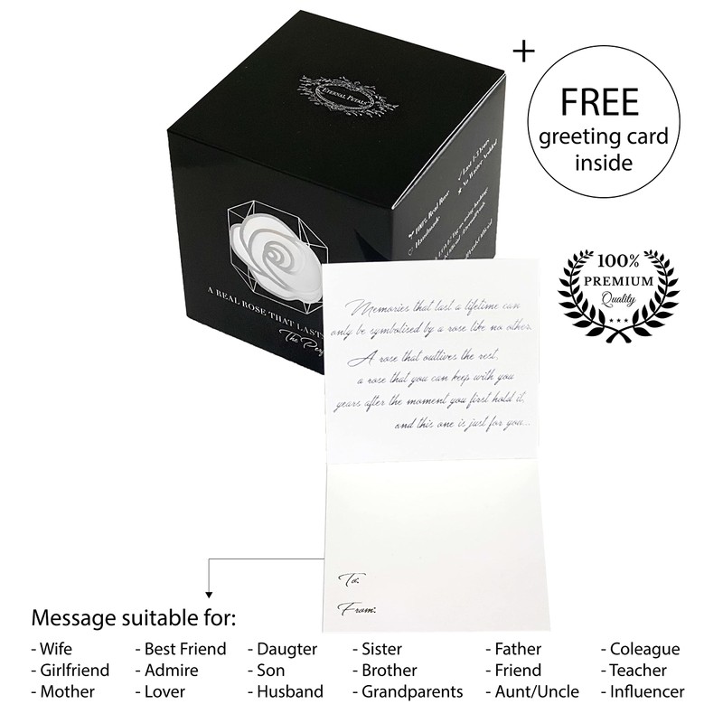 - ✮ TRENDY BOX – Arriving in this stunning 8cm x 8cm x 8cm Diamond box with a white gold Eternal Petals logo, you’ll find a perfectly bloomed, real rose in authentically beautiful colour. The ultimate in classic romance, this rose defies nature with its striking magical pigment, which you can enjoy and admire for years