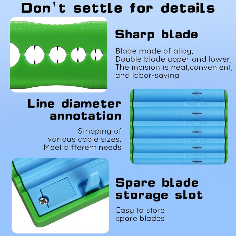 - Wire diameter labeling, multiple fiber optic cable sizes can be peeled to meet different needs, with spare blade storage slots for easy storage of spare blades