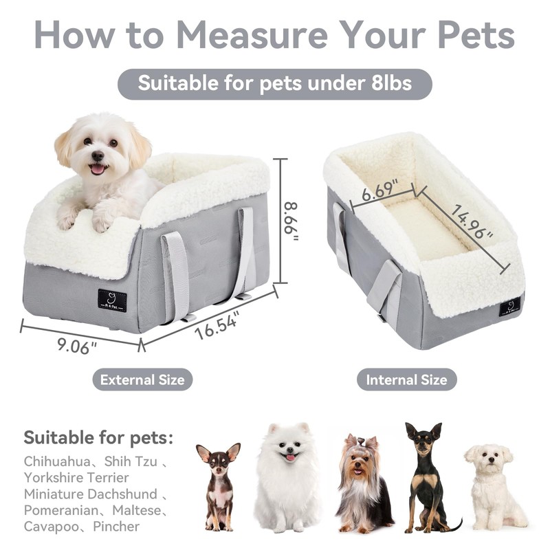 - Perfect Fit for Small Breeds: Measuring 17.3"×9.6"×8.5", this dog car seat consoles perfectly with Chihuahua、Shih Tzu 、Yorkshire Terrier Miniature Dachshund 、Pomeranian、Maltese, Cavapoo, Pincher and other pets under 8 lbs. The dog console car seat's compact size fits cars, SUVs and trucks without occupying passenger space.