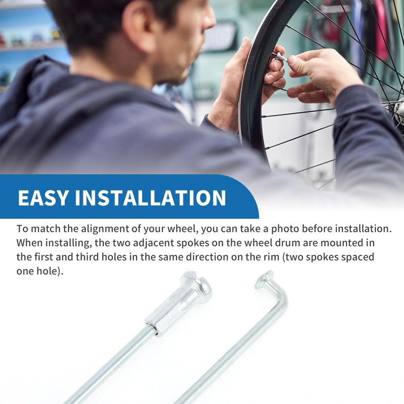 - Easy Installation: When installing, the two adjacent spokes on the wheel drum are mounted in the first and third holes in the same direction on the rim (two spokes spaced one hole). The length of bicycle spokes depends on the rim, hub, and braiding method. Please measure the old spokes and confirm the size before placing an order. To match the alignment of your wheel, you can take a photo before installation.