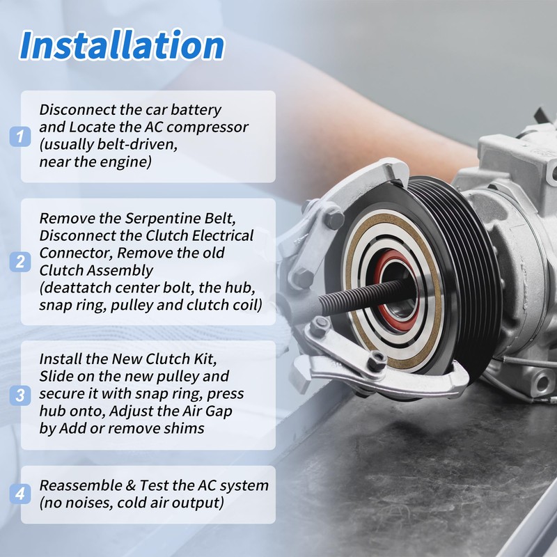 • [Installation] 1. Disconnect the car battery and Locate the AC compressor (usually belt-driven, near the engine). 2. Remove the Serpentine Belt, Disconnect the Clutch Electrical Connector, Remove the old Clutch Assembly( deattatch center bolt, the hub, snap ring, pulley and clutch coil). 3. Install the New Clutch Kit, Slide on the new pulley and secure it with snap ring, press hub onto, Adjust the Air Gap by Add or remove shims.4. Reassemble & Test the AC system(no noises, cold air output).