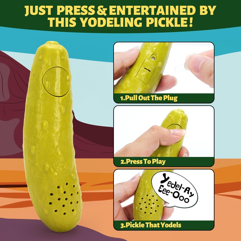 - Push-button Playback: Yodeling pickle toy is the size of a real life pickle with ripples down the sides. It has one big button that controls the yodel. Just press and everyone will be thoroughly entertained by this yodeling pickle! Good sound quality; Good volume