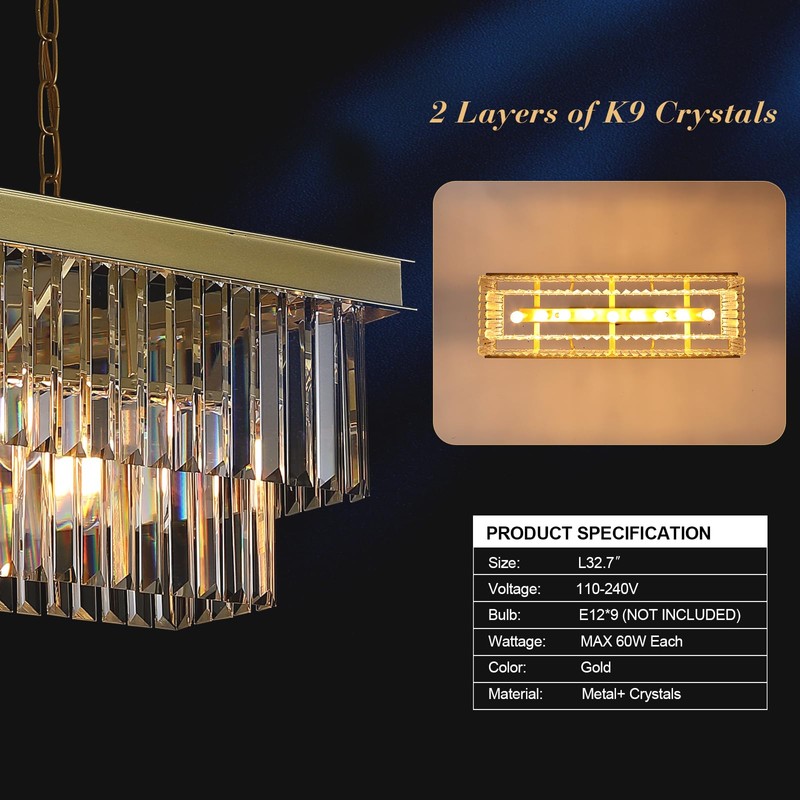 - 【Rectangular Chandelier 】This modern crystal chandelier designed into a rectangle shape, long chandelier suitable for your dining table or kitchen island, with 2 tiers of top grade K9 crystals covers the whole light fixture, it will be super stunning no matter when you turn on or off the light fixture, with the light sources changed, all the crystals will be reflected into sparkling like diamonds, elegant and never out of date at your home!