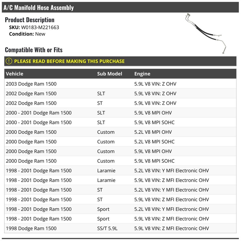 A/C Manifold Hose Assembly - Compatible with 1998-2003 Dodge Ram 1500