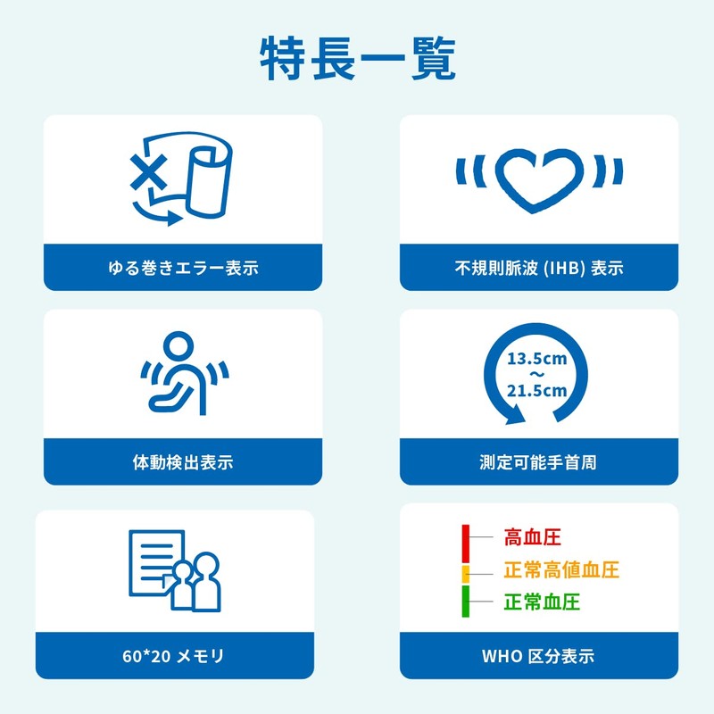- 60×2メモリ:2人分または朝・夜の測定データをそれぞれ最新60回分保存可能