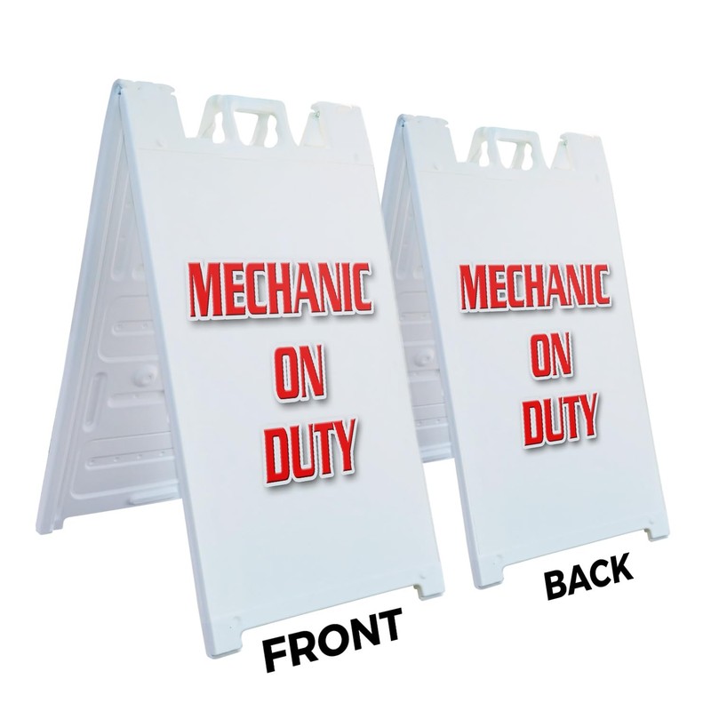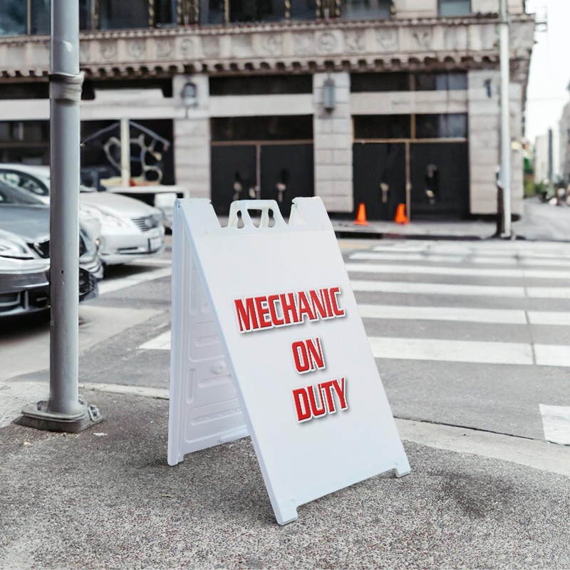 A-Frame Sidewalk Mechanic On Duty 24" x 36" Double Sided A-Frame Sidewalk Sign, Includes 2 Installed Vinyl Decals | Foldable Portable White Signicade Sandwich Board Signs