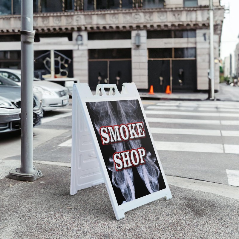 A-Frame Sidewalk Smoke Shop 24" x 36" Double Sided A-Frame Sidewalk Sign, Includes 2 Plastic Inserts | Foldable Portable White Signicade Sandwich Board Signs