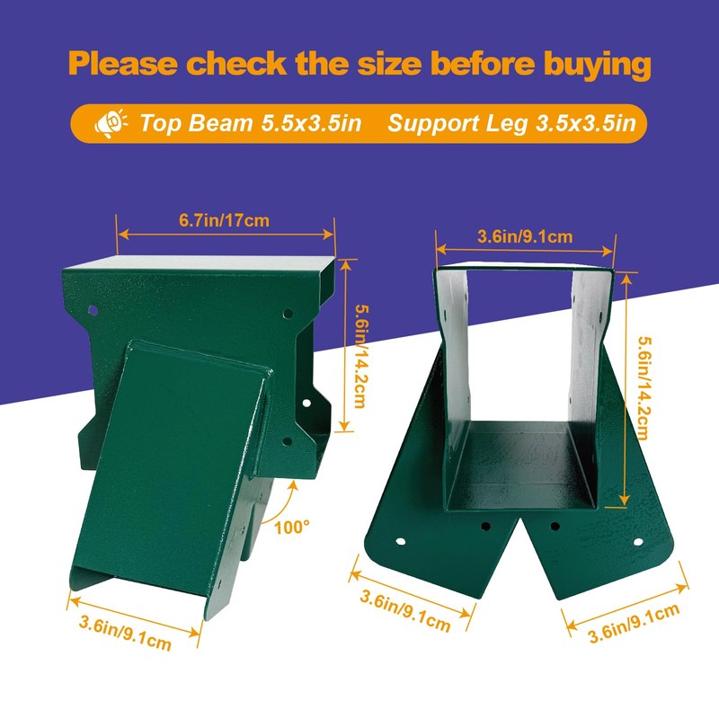 A-Frame Swing Set Brackets - DIY Swing Set Bracket for 4x4 Legs & 4x6 Beam, Installed on Wooden or Concrete Floors, Green (2 End Brackets+4 Bases+2 Hangers)