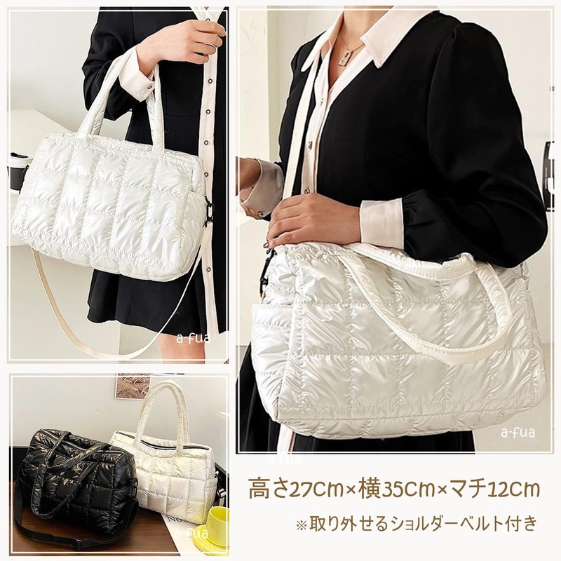 a-fua Women's Quilted Bag, Glossy, Nylon, Boston, Cross-body Shoulder Strap, Horizontal, Lightweight, Compact, Down, Commuting to Work, champagne gold