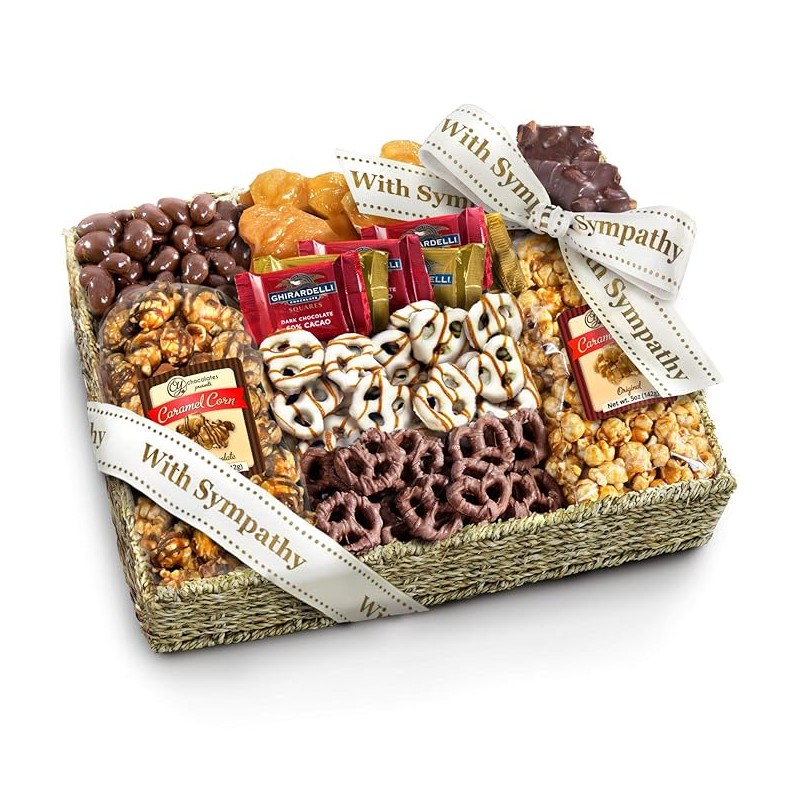 A Gift Inside With Sympathy Chocolate Caramel and Crunch Grand Gift Basket with Snacks, Ghirardelli and Chocolate-Covered Nuts